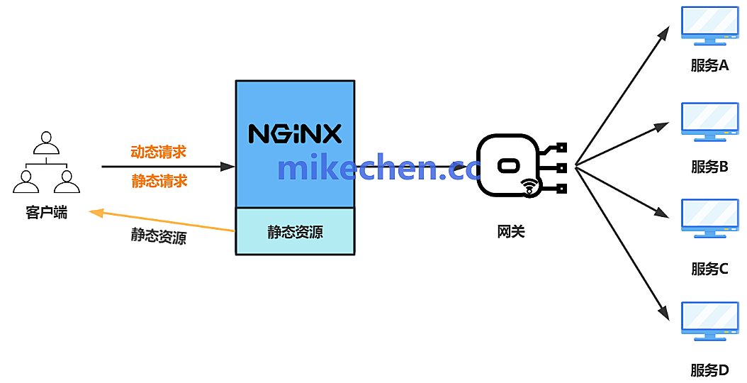 比如: HTML, CSS, JavaScript 文件、图片、视频等不需要后端处理的资源,由不同的服务器或不同的处理机制来负责。